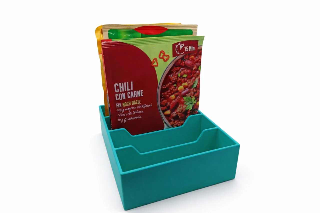 Dieses Produkt dient ausschließlich der Organisation und Aufbewahrung von verpackten Küchenzutaten. Für unsachgemäße Nutzung, Materialveränderungen durch Hitze oder mechanische Einwirkung wird keine Haftung übernommen. Bei 3D-gedruckten Varianten können material- und druckbedingte Abweichungen in Oberfläche und Stabilität auftreten. Verwendung erfolgt auf eigene Verantwortung.